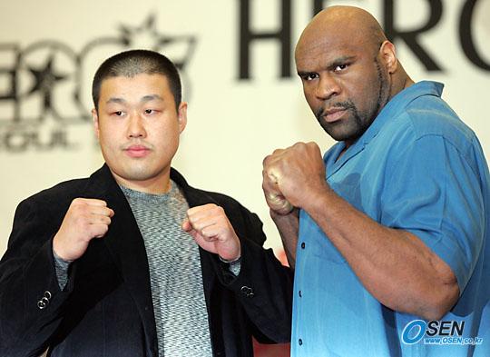 5일 서울 올림픽공원 체조경기장서 벌어질 K-1 코리아 맥스 & 히어로스 서울 대회 출전 선수 전원이 4일 오후 서울 논현동의 임피리얼 팰리스 호텔에서 합동 기자회견을 열었다. 한판 승부를 벌이게 된 김종왕과 밥 샙이 나란히 포즈를 취하고 있다./주지영 기자 jj0jj0@osen.co.kr [Copyright ⓒ OSEN(www.osen.co.kr) 무단전재 및 재배포 금지]