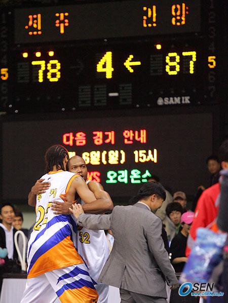 4일 안양 실내체육관에서 벌어진 2005~2006 KCC 프로농구 안양 KT&G와 전주 KCC의 경기서 87-78로 승리한 KT&G의 단테 존스(오른쪽)와 가이 루커가 서로 껴안으며 기뻐하고 있다./안양=주지영 기자 jj0jj0@osen.co.kr [Copyright ⓒ OSEN(www.osen.co.kr) 무단전재 및 재배포 금지]