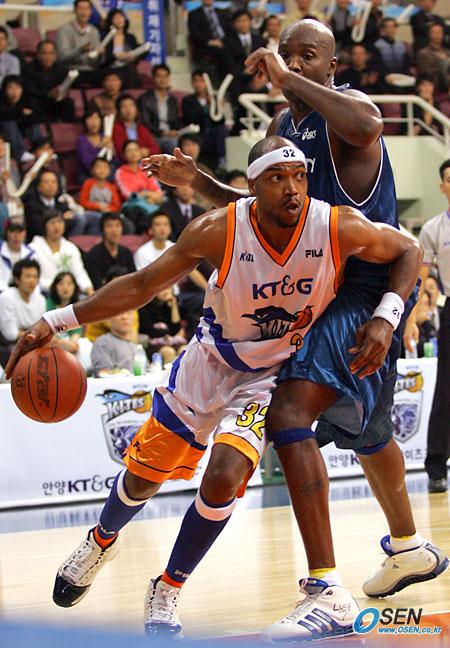 4일 안양 실내체육관에서 벌어진 2005~2006 KCC 프로농구 안양 KT&G와 전주 KCC의 경기서 KT&G의 단테 존스가 KCC의 새 용병 센터 쉐런 라이트를 따돌리고 골밑으로 드리블하고 있다./안양=주지영 기자 jj0jj0@osen.co.kr [Copyright ⓒ OSEN(www.osen.co.kr) 무단전재 및 재배포 금지]