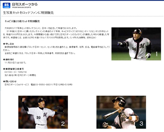 일본 최대의 스포츠전문지 가 롯데 마린스 이승엽(29)을 톱 모델로 교체, 일본시리즈 우승기념 사진 판매에 나서고 있다. 는 롯데가 지난 10월 26일 일본시리즈에서 우승한 직후 사고와 웹사이트를 통해 ‘31년만에 일본1위, 롯데 나인사진 특별판매’ 공고를 올렸다. 사진기자들이 2005시즌 동안 촬영한 롯데 선수들의 경기사진을 판매한다는 공고였다. 처음에는 이승엽의 사진이 없었다. 외국인 선수들에 대한 초상권을 의식, 는 이승엽을 비롯한 외국인 선수들을 제외하고 일본인 선수들의 사진만을 올렸다. 하지만 최근 여기에 이승엽의 사진이 추가됐다. 그런데 그냥 끼워 넣어진 것이 아니다. ‘No.1’으로 특별대접을 받고 있다. 홈페이지를 보면 다른 선수들의 사진은 모두 아래쪽에 두 줄로 길게 배열했지만 이승엽의 사진은 공고문 옆을 장식하고 있다. 홈런을 날린 후 오른손을 앞으로 쭉 뻗으며 포효하고 있는 모습에 '1'이라는 번호를 매겨 놓았다(사진). 이승엽을 1번으로 내세운 것은 인기를 고려한 판매전략도 들어 있는 것으로 보인다. 는 두 종류의 사진을 판매하고 있다. 18cmX 12cm 규격의 사진 25매 한 세트는 판매가격이 7000엔(약 6만 2000원)이다. 이것과 별도로 나무액자에 끼워져 있는 전지(A2)사이즈의 대형 사진은 한 장에 1만 1000엔(약 9만 8000원)을 붙여 놨다. 이 것은 한 장씩 구입하는 것이므로 이승엽의 대형사진 액자를 원하는 사람은 ‘1번’을 기입해 주문하면 된다. 이와 별도로 이승엽의 올 시즌 활약을 담은 사진은 롯데 마린스 홈페이지에도 다시 올라와 있다. 롯데 역시 초상권을 의식해 이승엽을 비롯한 외국인 선수들의 사진은 롯데의 우승직후 '포토갤러리’에서 잠시 제외 됐었다. 하지만 최근 이승엽의 사진을 비롯한 외국인 선수들의 사진이 다시 올라왔다. 홈페이지에는 이승엽의 타격뿐 아니라 팬에게 인사하는 모습, 경기후 히어로 인터뷰 등의 모습을 담은 25장의 사진이 올라와 있다. 박승현 기자 nanga@osen.co.kr [Copyright ⓒ OSEN(www.osen.co.kr) 무단전재 및 재배포 금지]