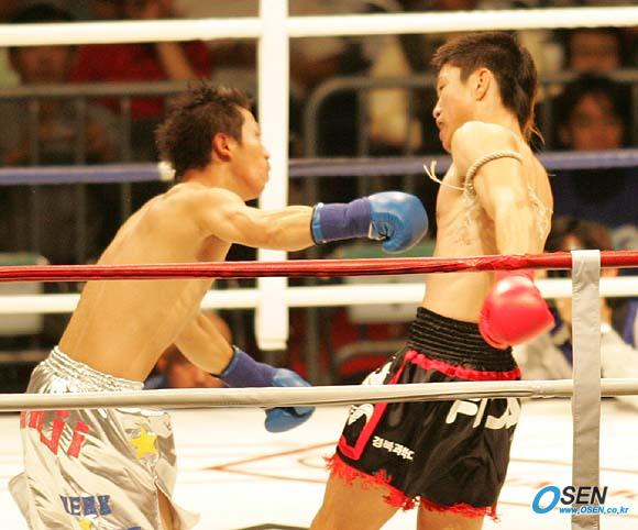 5일 서울 올림픽공원 체조경기장에서 벌어진 K-1 코리아 맥스 2005 대회 제3 경기서 '외팔이' 최재식(오른쪽)의 왼손 돌려치기를 맞은 일본의 긴지가 주먹을 허공에 휘드르며 무너지고 있다. 1라운드 2분 5초만에 최재식의 간단한 KO승./올림픽공원=손용호 기자 spjj@osen.co.kr [Copyright ⓒ OSEN(www.osen.co.kr) 무단전재 및 재배포 금지]