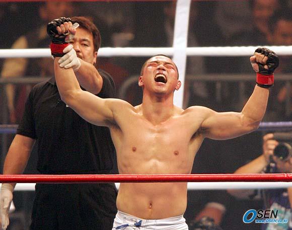 5일 서울 올림픽공원 체조경기장에서 벌어진 K-1 히어로스 2005 서울 대회 제2 경기서 1라운드서 야마모토 아쓰시에게 일방적으로 몰렸던 김종만이 2라운드서 파운딩으로 상대를 실신시키며 승리를 거둔 뒤 환호하고 있다./올림픽공원=손용호 기자 spjj@osen.co.kr [Copyright ⓒ OSEN(www.osen.co.kr) 무단전재 및 재배포 금지]