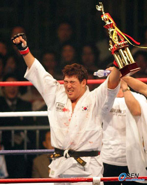 '죠스' 김민수(30)가 종합격투기 히어로스 무대 데뷔 첫 승을 거뒀다. 김민수는 5일 서울 잠실 올림픽공원 제1체육관(체조 경기장)에서 가진 히어로스 2005 서울 대회 제7경기에서 미국의 프로레슬링 단체 WWE 출신 파이터 숀 오헤어를 맞아 1라운드 4분 46초만에 길로틴 초크(허리의 힘을 이용해 상대의 목을 정면으로 잡아 조르는 기술)로 탭아웃을 얻어냈다. 지난 3월 26일 데뷔전에서 미국의 '야수' 밥 샙에게 1라운드 KO패, 지난 7월 6일 레이 세포에게 2라운드 KO패 당했던 김민수는 이로써 데뷔 7개월 여만에 히어로스 대회 첫 승을 거뒀다. 시작도 하기 전에 오헤어와의 눈싸움으로 기선 제압에 들어간 김민수는 시작 공이 울리자마자 폭풍같은 러시 공격으로 관중들의 환호를 이끌어냈으나 WWE 출신 레슬러 오헤어의 힘에 밀리며 고전했고 가드 포지션과 백 마운트에서 파운딩을 당하며 패색이 짙었다. 그러나 김민수는 오헤어의 힘을 물리치고 기어코 다시 일어섰고 오헤어의 목을 잡아 조르면서 히어로스 데뷔 첫승을 TKO로 장식했다. 김민수의 통쾌한 승리에도 불구하고 '한국과 세계'의 경쟁구도로 짜여진 이번 대회에서 한국의 간판 선수들이 잇따라 맥없이 물러나 국내 격투기 팬들의 아쉬움을 샀다. 오프닝 파이트에서 송언식이 1라운드 3분40초만에 암바(팔십자꺾기)로 일본의 아사노 마치히사에게 승리를 거둔데 이어 제2경기에 나선 김종만도 1라운드에서 집중 공격당한 불리함을 딛고 오히려 2라운드에서 폭발적인 파운딩을 퍼부어 2라운드 2분45초만에 TKO승을 거두긴 했으나 이후 제3경기부터 제6경기는 한국 선수들이 기를 펴지 못했다. 허승진의 한계체중 초과로 대타로 참가한 곽윤섭이 제3경기에서 일본의 강호 오야마 슌고에 1라운드 1분14초만에 아킬레스 홀드(상대의 발목을 팔로 감고 뒤로 쓰러져 항복을 받아내는 기술)로 기권패하더니 제4경기에 나선 조정환 역시 리어네이키드 초크(뒤에서 상대방을 품에 안는 자세로 경동맥을 조르는 기술)로 일본의 쿠니오크 키우마에게 1라운드 2분1초만에 무릎을 꿇고 말았다. 또 제5경기에 나선 임준수는 1라운드 50초만에 프랑스의 크리스토프 미도 '더 피닉스'에 TKO 당했고 국내 격투기 강호로 꼽히는 이면주 마저 일본의 오카미 유신에게 1라운드 1분40초만에 TKO로 물러났다. ■ 히어로스 2005 서울대회 결과 (오프닝 파이트~제7경기) 오프닝 파이트 송언식 (1R 3분40초 암바) 아사노 미치히사 제1경기 다카야 히로유키 (3-0 판정) 김도형 제2경기 김종만 (2R 4분25초 TKO) 야마모토 아츠시 제3경기 오야마 슌고 (1R 1분14초 아킬레스 홀드) 곽윤섭 제4경기 쿠니오쿠 키우마 (1R 2분1초 리어네이키드 초크) 조정환 제5경기 크리스토프 미도 '더 피닉스' (1R 50초 TKO) 임준수 제6경기 오카미 유신 (1R 4분14초 TKO) 이면주 제7경기 김민수 (1R 4분46초 길로틴 초크) 숀 오헤어 중간 전적 - 한국 3 : 5 세계 올림픽공원=박상현 기자 tankpark@osen.co.kr [Copyright ⓒ OSEN(www.osen.co.kr) 무단전재 및 재배포 금지]