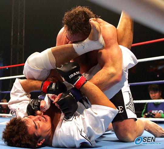 5일 서울 올림픽공원 체조경기장에서 벌어진 K-1 히어로스 2005 서울 대회 제7 경기서 김민수가 링에 누운 상태서 숀 오헤어의 파운딩을 손과 발로 저지하고 있다./올림픽공원=주지영 기자 jj0jj0@osen.co.k [Copyright ⓒ OSEN(www.osen.co.kr) 무단전재 및 재배포 금지]