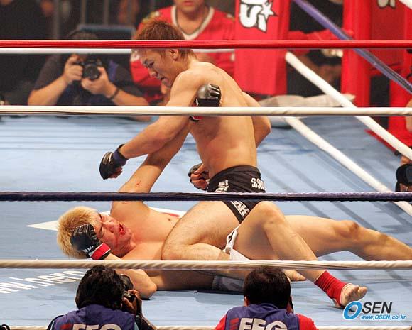 5일 서울 올림픽공원 체조경기장에서 벌어진 K-1 히어로스 2005 서울 대회 제6 경기서 이면주가 오카미 유신에게 1라운드에서 기권패을 당했다. 오카미가 이면주의 복부를 타고 앉아 파운딩을 퍼붓자 세컨드가 타월을 던졌다. 오카미가 이면주의 안면에 파운딩을 가하고 있다./올림픽공원=손용호 기자 spjj@osen.co.kr [Copyright ⓒ OSEN(www.osen.co.kr) 무단전재 및 재배포 금지]