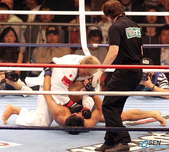 5일 서울 올림픽공원 체조경기장에서 벌어진 K-1 히어로스 마지막 제11 경기서 추성훈이 오쿠다 마사카쓰에 파운딩 공격으로 TKO승을 거두었다. 추성훈은 경기 소감을 말하며 자신은 귀화를 해서 한국 사람이 아니지만 자신의 몸에는 한국인의 피가 흐른다며 고국에 대한 진한 애정을 표시했다. 추성훈이 승리를 결정짓는 파운딩 공격을 하고 있다./올림픽공원=손용호 기자 spjj@osen.co.kr [Copyright ⓒ OSEN(www.osen.co.kr) 무단전재 및 재배포 금지]
