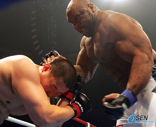 5일 서울 올림픽공원 체조경기장에서 벌어진 히어로스 2005 서울 대회 제9 경기서 밥 샙이 시작하자마자 김종왕을 코너에 몰아넣고 일방적으로 공격, 8초만에 눕혀 버렸다./올림픽공원=주지영 기자 jj0jj0@osen.co.k [Copyright ⓒ OSEN(www.osen.co.kr) 무단전재 및 재배포 금지]