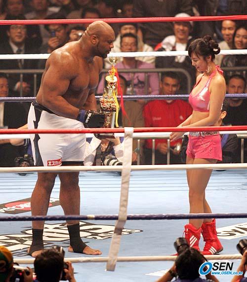5일 서울 올림픽공원 체조경기장에서 벌어진 K-1 히어로스 2005 서울 대회 제9 경기서 김종왕을 8초만에 KO로 눕힌 밥 샙이 자신에 트로피를 건네 K-1 걸에게 고개를 숙여 인사하자 K-1 걸이 얼굴을 제대로 들지 못하고 있다./올림픽공원=손용호 기자 spjj@osen.co.kr [Copyright ⓒ OSEN(www.osen.co.kr) 무단전재 및 재배포 금지]