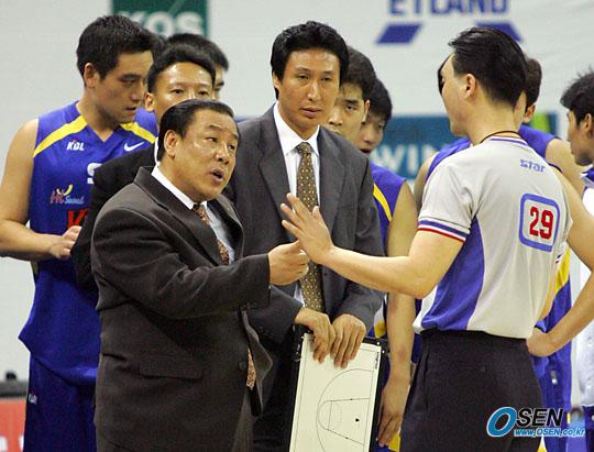 6일 부천 실내체육관에서 벌어진 2005~2006 KCC 프로농구 인천 전자랜드 블랙슬래머와 서울 SK 나이츠의 경기 4쿼터 종료를 얼마 남기지 않고 SK에서 전희철에 이어 화이트헤드가 5반칙으로 퇴장 당하자 김태환 감독이 심판에게 항의하고 있다./부천=주지영 기자 jj0jj0@osen.co.kr [Copyright ⓒ OSEN(www.osen.co.kr) 무단전재 및 재배포 금지]