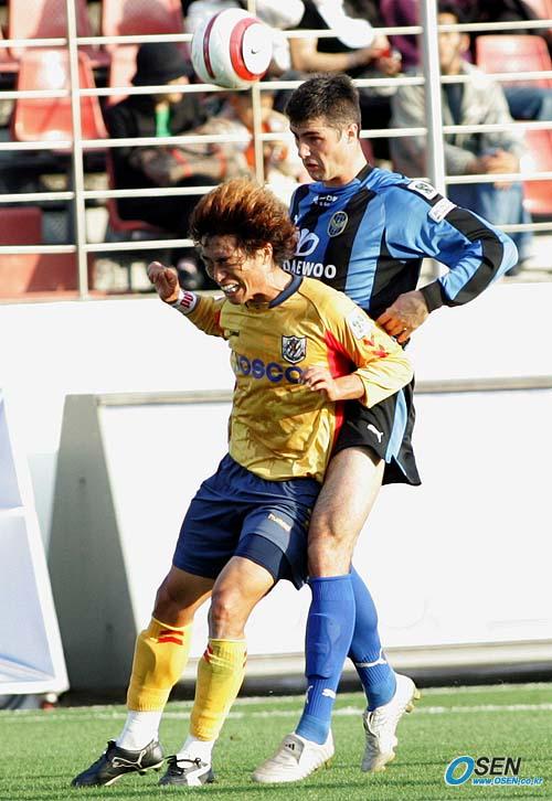 6일 광양 전용구장에서 벌어진 전남 드래곤스와 인천 유나이티드의 경기 전반 전남의 김태영이 인천의 라돈치치에 앞서 헤딩으로 공을 걷어내고 있다. 김태영은 하프타임때 은퇴식을 가지고 후반 10분여를 더 뛰고 경기장을 떠났다./광양=손용호기자spjj@osen.co.kr [Copyright ⓒ OSEN(www.osen.co.kr) 무단전재 및 재배포 금지]