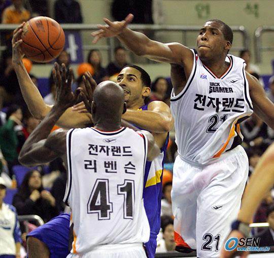 6일 부천실내체육관에서 벌어진 2005~2006 KCC 프로농구 인천 전자랜드 블랙슬래머와 서울 SK 나이츠의 경기서 SK의 게이브 미나케 일시 교체 용병 루크 화이트헤드(가운데)가 레이업슛을 시도하자 전자랜드이 리 벤슨과 앨버트 화이트의 일시 대체 용병인 해롤드 아세노가 동시에 달려들고 있다./부천=주지영 기자 jj0jj0@osen.co.kr [Copyright ⓒ OSEN(www.osen.co.kr) 무단전재 및 재배포 금지]