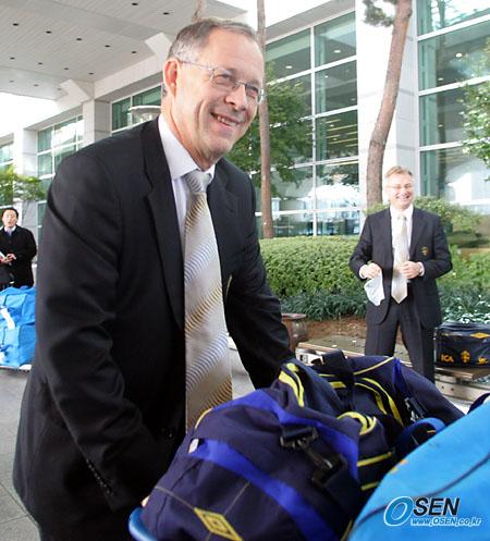 오는 12일 한국과 친선 경기를 가질 스웨덴대표팀이 9일 오후 KE906편으로 인천공항을 통해 입국했다. 라르스 라거백 스웨덴 감독이 웃으면서 버스로 짐을 밀고 가고 있다./인천공항=주지영 기자 jj0jj0@osen.co.kr [Copyright ⓒ OSEN(www.osen.co.kr) 무단전재 및 재배포 금지]