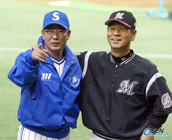 10일 개막될 코나미컵 아시아시리즈 2005 대회에 대비, 출전팀들이 8일 도쿄돔에서 훈련을 가졌다. 김성근 롯데 마린스 코디네이터가 한대화 삼성 라이온즈 코치의 어깨에 손을 얹고 반가워 하고 있다. 한 코치는 현역 시절의 마지막을 당시 쌍방울의 김성근 감독 밑에서 보냈다./도쿄돔=손용호 기자spjj@osen.co.kr [Copyright ⓒ OSEN(www.osen.co.kr) 무단전재 및 재배포 금지]