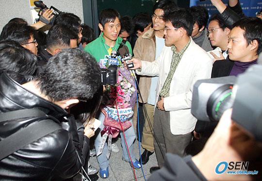 오는 12일 스웨덴 및 16일 세르비아-몬테네그로와 친선경기를 가질 한국대표팀의 이영표가 9일 오후 영국에서 KE908편으로 인천공항을 통해 귀국했다. 이영표가 많은 취재진 속에서 인터뷰를 하고 있다./인천공항=주지영 기자 jj0jj0@osen.co.kr [Copyright ⓒ OSEN(www.osen.co.kr) 무단전재 및 재배포 금지]