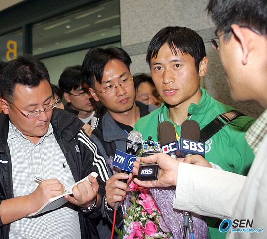 오는 12일 스웨덴 및 16일 세르비아-몬테네그로와 친선경기를 가질 한국대표팀의 이영표가 9일 오후 런던으로부터 KE908편으로 인천공항을 통해 귀국했다. 이영표가 꽃다발을 들고 인터뷰하고 있다./인천공항=주지영 기자 jj0jj0@osen.co.kr [Copyright ⓒ OSEN(www.osen.co.kr) 무단전재 및 재배포 금지]