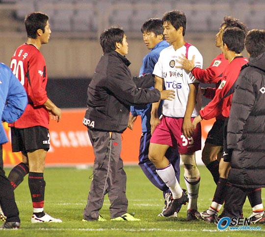 9일 부천 종합운동장서 벌어진 부천 SK와 대전 시티즌의 경기가 1-1로 끝난 뒤 대전이 최거룩(흰 유니폼)이 부천의 최철우와 시비가 붙자 양 팀 관계자들이 말리고 있다./부천=주지영 기자 jj0jj0@osen.co.kr [Copyright ⓒ OSEN(www.osen.co.kr) 무단전재 및 재배포 금지]