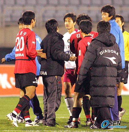 9일 부천 종합운동장에서 벌어진 부천 SK와 대전 시티즌의 정규리그 최종전이 1-1로 끝난 뒤 부천의 최철우(왼쪽)와 대전의 최거룩 사이에 시비가 붙자 양 팀 관계자들이 말리고 있다. 부천은 이날 비김으로써 후기리그 우승에 실패하며 플레이오프 진출 티켓도 놓쳤고 대전은 다 이기던 경기를 후반 막판 동점골을 내주고 비겼다./부천=주지영 기자 jj0jj0@osen.co.kr [Copyright ⓒ OSEN(www.osen.co.kr) 무단전재 및 재배포 금지]