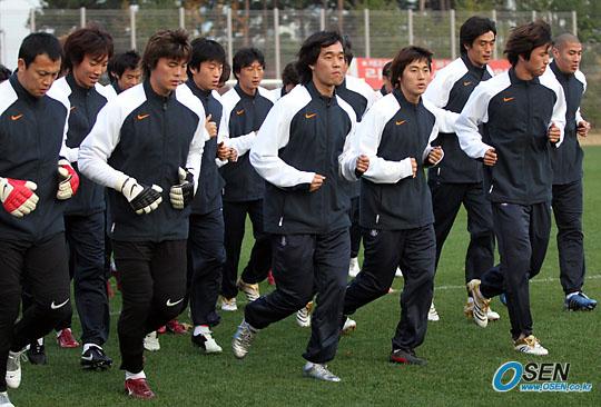 오는 12일 스웨덴 및 16일 세르비아-몬테네그로와 친선경기를 가질 한국대표팀이 10일 낮 서울 홍은동 그랜드 힐튼 호텔로 소집된 뒤 오후 3시 30분부터 상암 월드컵경기장 보조구장에서 첫 훈련을 소화했다. 새 훈련복을 입은 대표선수들이 운동장을 뛰며 몸을 풀고 있다./주지영 기자 jj0jj0@osen.co.kr [Copyright ⓒ OSEN(www.osen.co.kr) 무단전재 및 재배포 금지]
