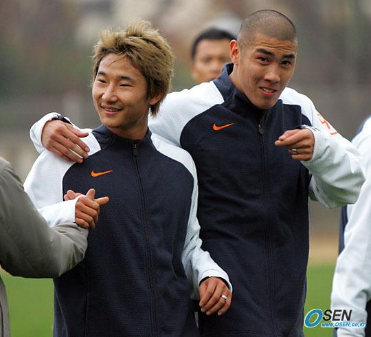 훈련 후 어깨동무를 하고 나오는 이천수와 차두리