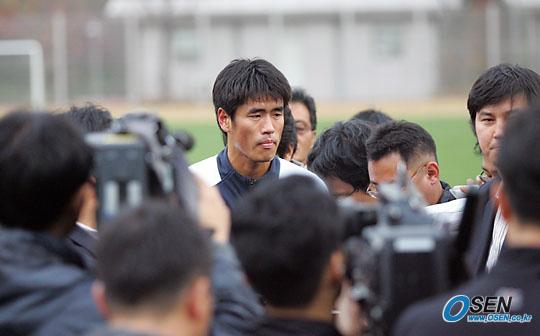기자들에 둘러싸여 인터뷰하는 설기현
