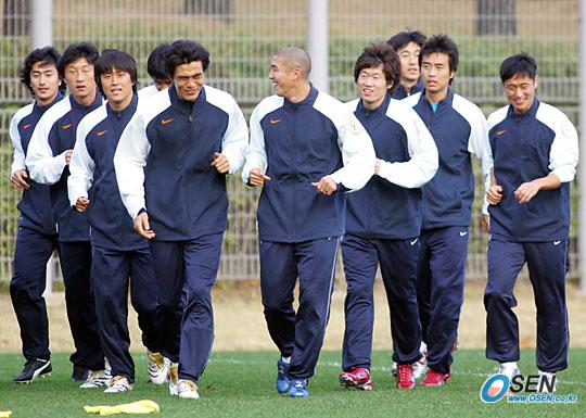 오는 12일 스웨덴 및 16일 세르비아-몬테네그로와 친선경기를 가질 한국대표팀이 10일 낮 서울 홍은동 그랜드 힐튼 호텔로 소집된 뒤 오후 3시 30분부터 상암 월드컵경기장 보조구장에서 첫 훈련을 소화했다. 대표선수들이 즐거운 표정으로 운동장을 돌며 몸을 풀고 있다./주지영 기자 jj0jj0@osen.co.kr [Copyright ⓒ OSEN(www.osen.co.kr) 무단전재 및 재배포 금지]