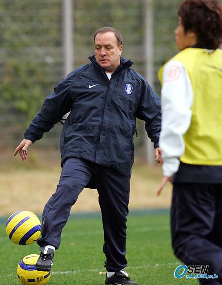 오는 12일 스웨덴 및 16일 세르비아-몬테네그로와 친선경기를 가질 한국대표팀이 10일 낮 서울 홍은동 그랜드 힐튼 호텔로 소집된 뒤 오후 3시 30분부터 상암 월드컵경기장 보조구장에서 첫 훈련을 소화했다. 아드보카트 감독이 볼을 다루고 있다./주지영 기자 jj0jj0@osen.co.kr [Copyright ⓒ OSEN(www.osen.co.kr) 무단전재 및 재배포 금지]