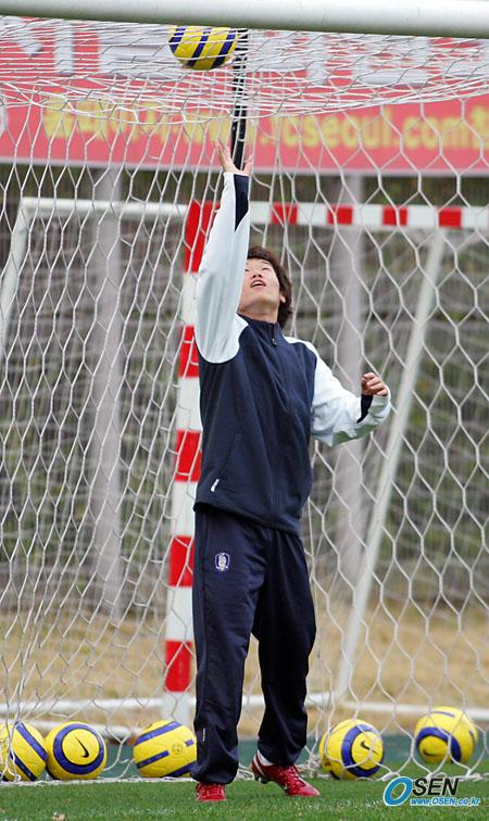 오는 12일 스웨덴 및 16일 세르비아-몬테네그로와 친선경기를 가질 한국대표팀이 10일 낮 서울 홍은동 그랜드 힐튼 호텔로 소집된 뒤 오후 3시 30분부터 상암 월드컵경기장 보조구장에서 첫 훈련을 소화했다. 박지성이 골문 윗그물에 얹힌 공을 쳐서 떨어뜨리고 있다./주지영 기자 jj0jj0@osen.co.kr [Copyright ⓒ OSEN(www.osen.co.kr) 무단전재 및 재배포 금지]