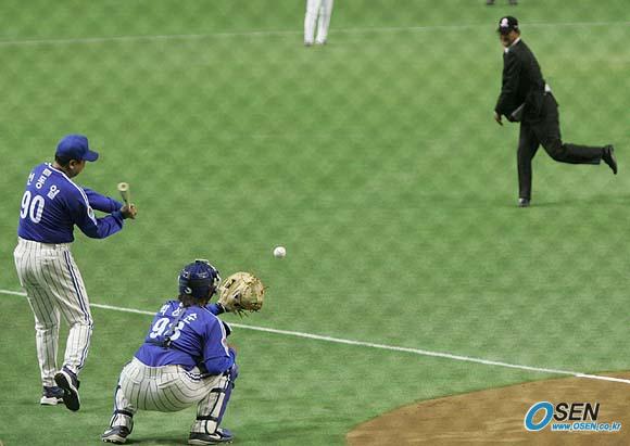 10일 일본 도쿄돔에서 개막된 코나미컵 아시아시리즈 2005대회 삼성과 롯데 마린스의 두 번째 경기에 앞서 과거 삼성에서 뛰었던 재일동포 김일융 씨와 선동렬 감독이 삼성측의 시구와 시타를 하고 있다. 양 측은 동시에 각각 시구와 시타 행사를 가졌다./도쿄돔=손용호 기자 spjj@osen.co.kr [Copyright ⓒ OSEN(www.osen.co.kr) 무단전재 및 재배포 금지]