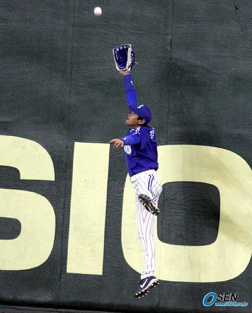 10일 일본 도쿄돔에서 개막된 코나미컵 아시아시리즈 2005대회 삼성과 롯데 마린스의 두 번째 경기 롯데의 1회말 선두타자 니시오카가 날린 타구를 잡으려고 삼성 우익수 강동우가 점프했으나 볼은 펜스에 직접 맞고 튀어 나와 3루타가 됐다. 롯데는 니시오카의 3루타를 발판으로 1회에만 3점을 뽑았다. /도쿄돔=손용호 기자 spjj@osen.co.kr [Copyright ⓒ OSEN(www.osen.co.kr) 무단전재 및 재배포 금지]