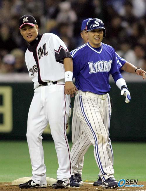 10일 일본 도쿄돔에서 개막된 코나미컵 아시아시리즈 2005대회 삼성과 롯데 마린스의 경기는 롯데 마린스의 6-2 승리로 끝났다. 8회초 안타를 치고 1루에 나간 박진만이 대주자 강명구로 교체되면서 이승엽과 이야기를 나누고 있다./도쿄돔=손용호 기자 spjj@osen.co.kr [Copyright ⓒ OSEN(www.osen.co.kr) 무단전재 및 재배포 금지]