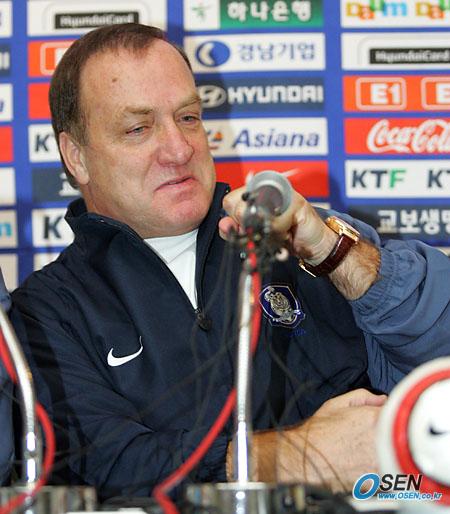 한국대표팀이 오는 12일 스웨덴과의 친선경기에 앞서 오전 서울 홍은동 그랜드 힐튼 호텔에서 합동 인터뷰를 가졌다. 마지막으로 기자회견에 나선 아드보카트 감독이 뒤에 설치된 마이크를 보고는 노래하는 행동을 취하며 웃고 있다./주지영 기자 jj0jj0@osen.co.kr [Copyright ⓒ OSEN(www.osen.co.kr) 무단전재 및 재배포 금지]