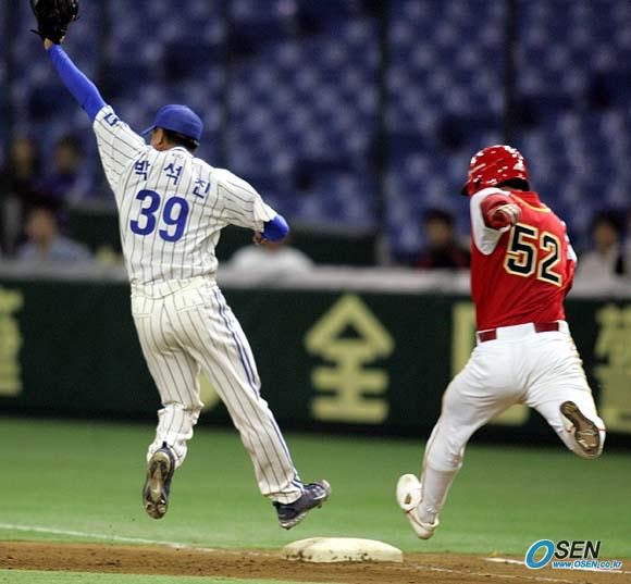 삼성이 11일 도쿄돔에서 벌어진 코나미컵 아시아시리즈 2005대회 중국 올스타와의 2차전서 8-3으로 승리했다. 삼성이 6-0으로 앞서던 6회초 2사 2루서 1루 땅볼 때 투수 박석진의 베이스 커버가 늦어 타자 주자 왕웨이와 동시에 1루를 밟고 있다. 결과는 세이프가 됐고 삼성은 이후 연속 안타를 허용, 3실점했다./도쿄돔=손용호 기자 spjj@osen.co.kr [Copyright ⓒ OSEN(www.osen.co.kr) 무단전재 및 재배포 금지]