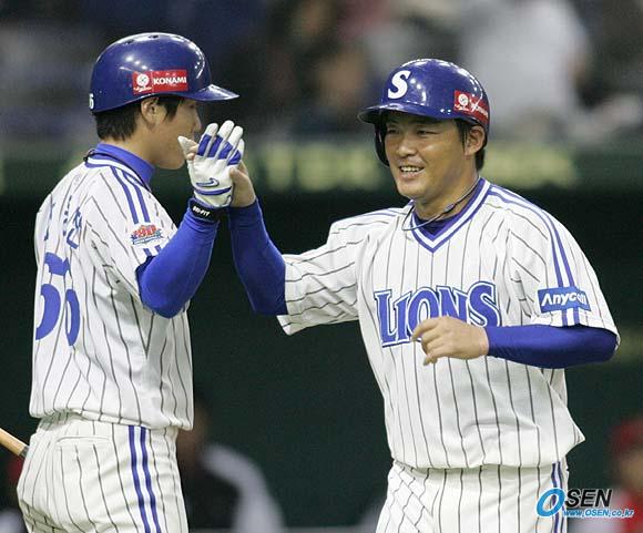 삼성이 11일 도쿄돔에서 벌어진 코나미컵 아시아시리즈 2005대회 중국과의 2차전서 8-3으로 승리했다. 5회말 2사 1,3루서 김재걸의 안타 때 홈을 밟은 김대익(오른쪽)이 환하게 웃으며 조동찬과 하이파이브를 나누고 있다./도쿄돔=손용호 기자 spjj@osen.co.kr [Copyright ⓒ OSEN(www.osen.co.kr) 무단전재 및 재배포 금지]