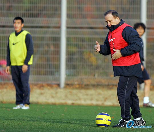 오는 12일 스웨덴 및 16일 세르비아-몬테네그로와 친선경기를 가질 한국대표팀이 11일 오후 상암 월드컵경기장 보조구장에서 전술 훈련을 실시했다. 아드보카트 감독이 직접 공을 차며 시범을 보이고 있다. /주지영 기자 jj0jj0@osen.co.kr [Copyright ⓒ OSEN(www.osen.co.kr) 무단전재 및 재배포 금지]
