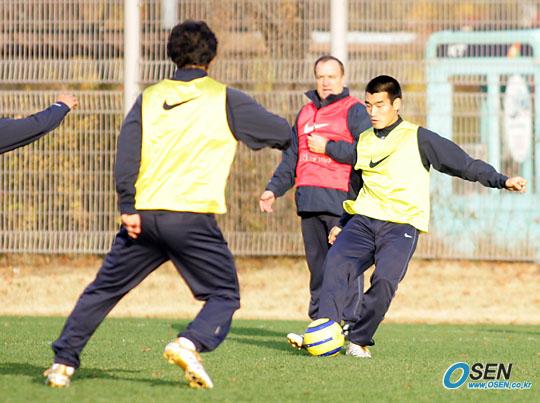 오는 12일 스웨덴 및 16일 세르비아-몬테네그로와 친선경기를 가질 한국대표팀이 11일 오후 상암 월드컵경기장 보조구장에서 전술 훈련을 실시했다. 아드보카트 감독 간이 연습경기를 지켜보는 가운데 조원희(오른쪽)가 패스하고 있다. /주지영 기자 jj0jj0@osen.co.kr [Copyright ⓒ OSEN(www.osen.co.kr) 무단전재 및 재배포 금지]