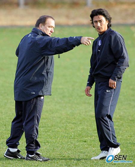 오는 12일 스웨덴 및 16일 세르비아-몬테네그로와 친선경기를 가질 한국대표팀이 11일 오후 상암 월드컵경기장 보조구장에서 전술 훈련을 실시했다. 아드보카트 감독이 안정환에게 지시를 내리고 있다./주지영 기자 jj0jj0@osen.co.kr [Copyright ⓒ OSEN(www.osen.co.kr) 무단전재 및 재배포 금지]