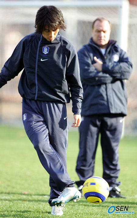 오는 12일 스웨덴 및 16일 세르비아-몬테네그로와 친선경기를 가질 한국대표팀이 11일 오후 상암 월드컵경기장 보조구장에서 전술 훈련을 실시했다. 아드보카트 감독이 박주영이 훈련하는 모습을 뒤에서 지켜보고 있다./주지영 기자 jj0jj0@osen.co.kr [Copyright ⓒ OSEN(www.osen.co.kr) 무단전재 및 재배포 금지]