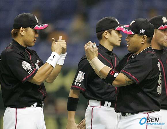 11일 도쿄돔에서 벌어진 코나미컵 아시아시리즈 2005대회 싱농 불스와 롯데 마린스의 경기는 롯데의 7회 12-1 콜드게임승으로 끝났다. 경기 전 선수 소개 순서에서 이승엽과 베니가 양쪽 엄지를 들어보이는 특이한 인사를 나누고 있다./도쿄돔=손용호 기자 spjj@osen.co.kr [Copyright ⓒ OSEN(www.osen.co.kr) 무단전재 및 재배포 금지]