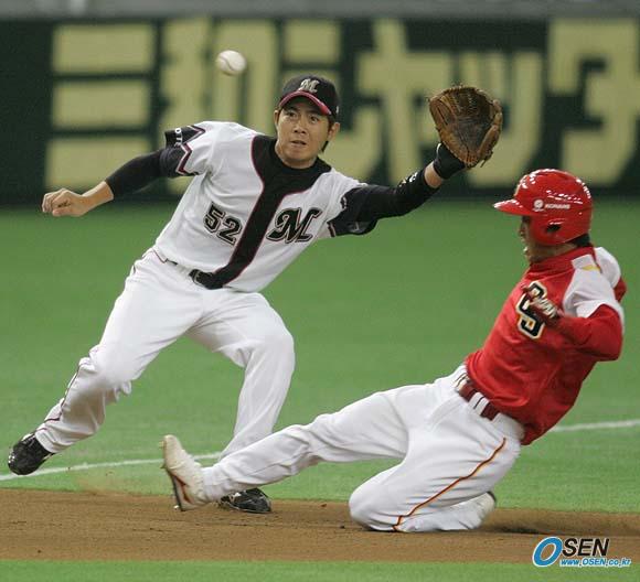 12일 도쿄돔에서 벌어진 코나미컵 아시아시리즈 2005대회 롯데 마린스와 중국 대표팀과의 경기는 롯데가 3-1로 신승을 거두었다.중국 1회초 2사 2루 호우펑리안이 3루 도루를 시도하고 있다. 롯데 3루수 헤이우치 히사오가 공을 빠트려 호우펑리안이 홈을 밟아 손쉽게 선취점을 올렸다./도쿄돔=손용호 기자 spjj@osen.co.kr [Copyright ⓒ OSEN(www.osen.co.kr) 무단전재 및 재배포 금지]