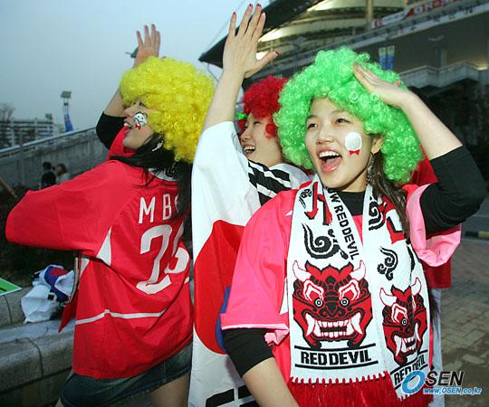 12일 스웨덴과의 평가전을 앞둔 서울 상암월드컵구장 앞에서 소녀 팬들이 분장을 하고 응원 준비를 하다 사진기자가 사진을 찍자'미녀 삼총사'를 외치며 포즈를 취하고 있다./상암=주지영 기자 jj0jj0@osen.co.kr [Copyright ⓒ OSEN(www.osen.co.kr) 무단전재 및 재배포 금지]