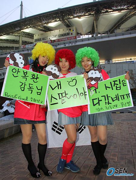 12일 스웨덴과의 평가전에 앞서 붉은악마가 경기장 밖에서 응원준비를 하고 있다. 분장을 한 소녀 팬들이 '안복환 감독님'이란 플래카드등 여러가지 플래카드를 들고 포즈를 취하고 있다./상암=주지영 기자 jj0jj0@osen.co.kr [Copyright ⓒ OSEN(www.osen.co.kr) 무단전재 및 재배포 금지]