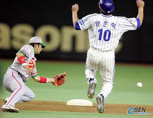 12일 일본 도쿄돔에서 열린 '코나미컵 아시아시리즈 2005' 삼성과 대만 싱농 불스전 1회 김한수의 우익수 희생 파울플라이 때 2루로 태그업한 1루 주자 양준혁이 상대 악송구를 틈타 3루까지 달려 세이프되고 있다./도쿄돔=손용호 기자 spjj@osen.co.kr [Copyright ⓒ OSEN(www.osen.co.kr) 무단전재 및 재배포 금지]