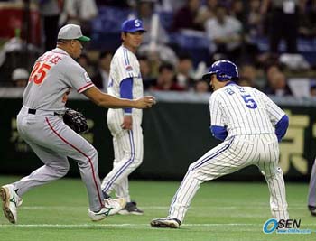 4점을 너무 쉽게 얻어 집중력이 떨어졌을까. 삼성이 한 이닝에 세 차례나 주루 실수를 범해 2루타 두 개를 치고도 한 점을 못 뽑는 보기 드문 장면을 연출했다. 12일 일본 도쿄돔에서 펼쳐진 삼성과 대만 싱농 불스의 예선 마지막 경기. 삼성은 1회와 2회 싱농 내야진이 거푸 실책을 범한 덕에 안타 한 개 치지 않고도 4점을 따냈다. 1회 사사구 3개로 만든 무사 만루에선 김한수의 희생 플라이와 싱농 2루수 황충이의 에러, 김대익의 희생 플라이로 3점을 뽑았다. 이어 2회에도 볼넷과 싱농 유격수 장자하오의 1루 악송구로 한 점을 보탰다. 완승으로 갈 수 있는 분위기는 그러나 3회 삼성의 잇단 본헤드 플레이로 급반전했다. 3회초 공격 선두타자로 나서 좌익선상 2루타를 치고나간 양준혁은 다음 타자 김한수의 좌중간 펜스에 직접 맞는 2루타 때 어이없는 주루 미스를 범했다. 타구가 워낙 잘 맞아 홈런이 아니면 최소한 2루타는 충분해 보였지만 2-3루 중간 쯤에서 상황을 판단해야 할 양준혁은 무슨 이유에선지 태그업을 할 것처럼 2루 베이스에 머물러 있었다. 김한수의 타구가 도쿄돔 좌중간 펜스를 직접 때리자 양준혁은 뒤늦게 3루로 내달려 연속 2루타가 터졌는데 점수가 나지 않았다. 실수는 또다른 실수를 불렀다. 이어진 1사 2,3루에서 박진만의 1루 땅볼 때 양준혁이 홈으로 뛰어들다 협격에 걸렸다. 양준혁이 협살 당하는 사이 이번엔 타자 주자 박진만이 1,2루 사이에서 어정쩡하게 서있다 다시 협격에 걸렸다. 선택의 여지가 없어진 2루 주자 김한수는 3루를 돌아 홈으로 달려들었지만 다시 런다운에 걸려 태그아웃됐다(사진). 2루타 두 개로 결국 한 점을 못 내고 공수교대. 화가 난 김한수는 헬멧을 벗어 내동댕이쳤다. 이후론 완전히 다른 경기처럼 분위기가 바뀌었다. 싱농은 선발 오스발도 마르티네스를 구원 등판한 호르헤 코르테스가 호투하면서 추가 실점을 허용하지 않았고 삼성은 잘 던지던 선발 하리칼라가 5회 집중 4안타를 허용하며 3점을 내줬다. 콜드게임도 가능할 것 같던 경기는 한 점차 승부가 됐고 선동렬 감독은 7회 배영수까지 투입하는 강수를 써야 했다. 도쿄돔=이종민 기자 mini@osen.co.kr [Copyright ⓒ OSEN(www.osen.co.kr) 무단전재 및 재배포 금지]