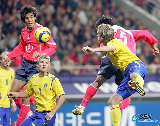 12일 저녁 서울 상암 월드컵경기장에서 벌어진 한국-스웨덴 친선경기 후반 5분 김영철(오른쪽에서 두 번째)이 헤딩으로 2-1을 만들고 있다. /상암=주지영 기자 jj0jj0@osen.co.kr [Copyright ⓒ OSEN(www.osen.co.kr) 무단전재 및 재배포 금지]