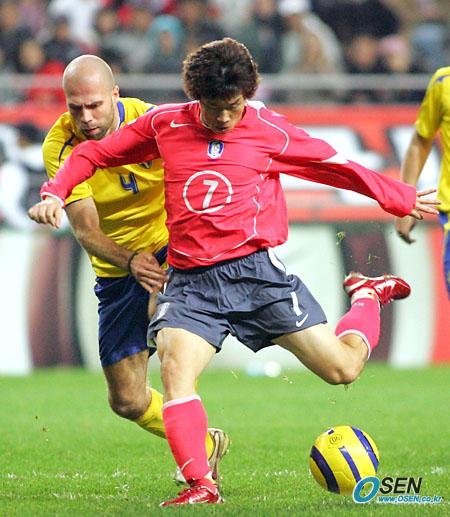 12일 저녁 서울 상암 월드컵경기장에서 벌어진 한국-스웨덴 친선경기는 2-2 무승부로 끝났다. 경기 후반 박지성이 다니엘 마이스트로비치를 따돌리며 슛을 날리고 있다./상암=주지영 기자 jj0jj0@osen.co.kr [Copyright ⓒ OSEN(www.osen.co.kr) 무단전재 및 재배포 금지]