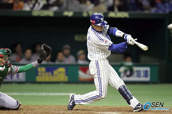 12일 도쿄돔에서 열린 코나미컵 아시아시리즈 2005 예선 마지막 날 삼성 라이온즈-싱농 불스전은 삼성이 4-3으로 신승했다. 3회말 무사 2루에서 김한수가 좌측펜스를 맞히는 2루타를 치고 있다. 그러나 타구의 방향을 예측하지 못한 2루주자 양준혁이 3루에 머물러 타점은 올리지 못했다./도쿄돔=손용호 기자 spjj@osen.co.kr [Copyright ⓒ OSEN(www.osen.co.kr) 무단전재 및 재배포 금지]