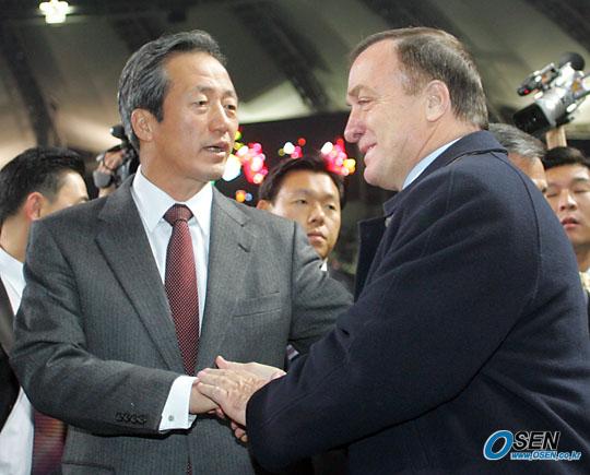 12일 저녁 서울 상암 월드컵경기장에서 벌어진 한국-스웨덴 친선경기는 2-2 무승부로 끝났다. 경기에 앞서 정몽준 대한축구협회장과 아드보카트 감독이 악수를 나누고 있다./상암=주지영 기자 jj0jj0@osen.co.kr [Copyright ⓒ OSEN(www.osen.co.kr) 무단전재 및 재배포 금지]