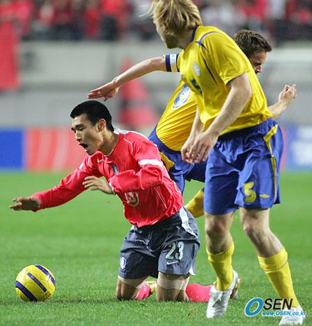 12일 저녁 서울 상암 월드컵경기장에서 벌어진 한국-스웨덴 친선경기는 2-2 무승부로 끝났다. 조원희가 스웨덴의 토비아스 린데로스(뒤)의 다리에 걸려 넘어지고 있다./상암=주지영 기자 jj0jj0@osen.co.kr [Copyright ⓒ OSEN(www.osen.co.kr) 무단전재 및 재배포 금지]