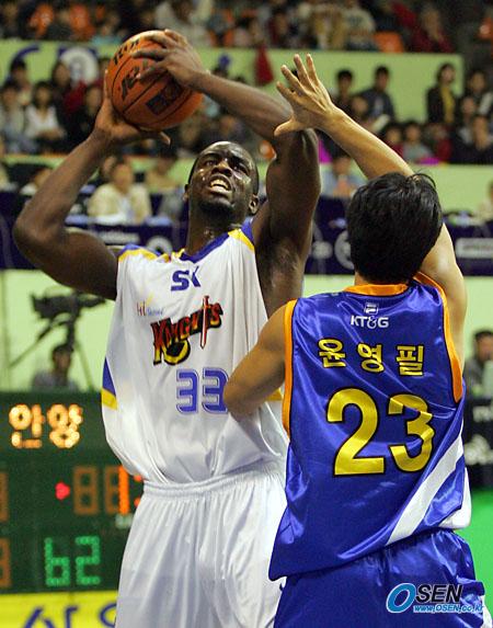 13일 잠실학생체육관에서 벌어진 서울 SK와 안양 KT&G의 2005~2006 KCC 프로농구서 SK의 웨슬리 윌슨이 KT&G의 윤영필을 앞에 두고 슛 타임을 잡고 있다./잠실학생체=주지영 기자 jj0jj0@osen.co.kr [Copyright ⓒ OSEN(www.osen.co.kr) 무단전재 및 재배포 금지]