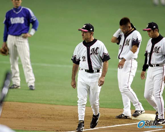 13일 일본 도쿄돔에서 펼쳐진 코나미컵 아시아시리즈 2005 삼성과 롯데 마린스의 결승전 1회말 배영수의 투구에 맞고 1루로 나간 이마에의 상태를 살펴보고 돌아오는 밸런타인 감독이 마운드의 배영수를 노려보고 있다. /도쿄돔=손용호 기자 spjj@osen.co.kr [Copyright ⓒ OSEN(www.osen.co.kr) 무단전재 및 재배포 금지]